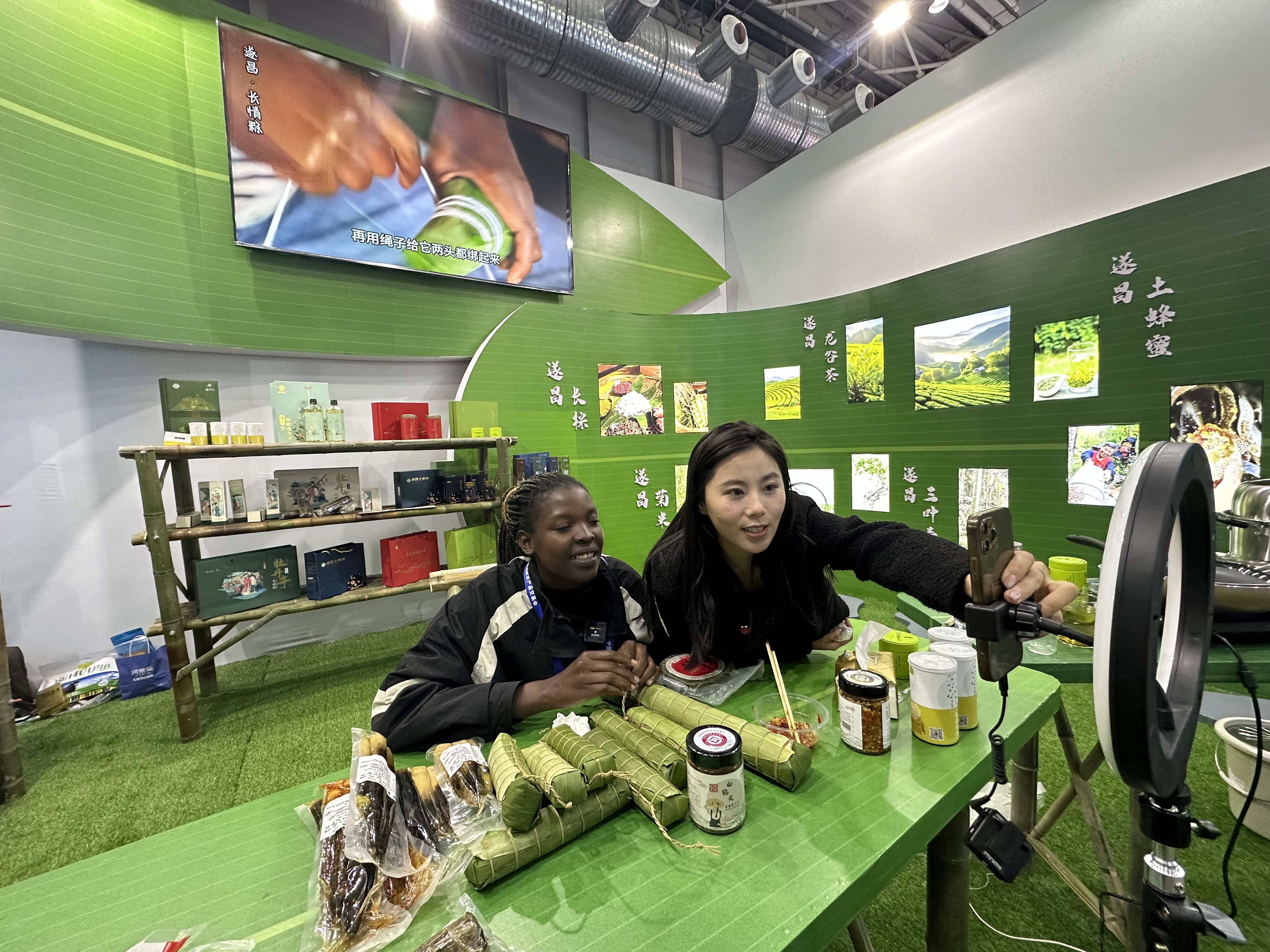 图为在农交会的国际展区,来自非洲的网红Rose正在面对镜头介绍来自浙江的遂昌长粽。农民日报·中国农网记者 侯雅洁 摄